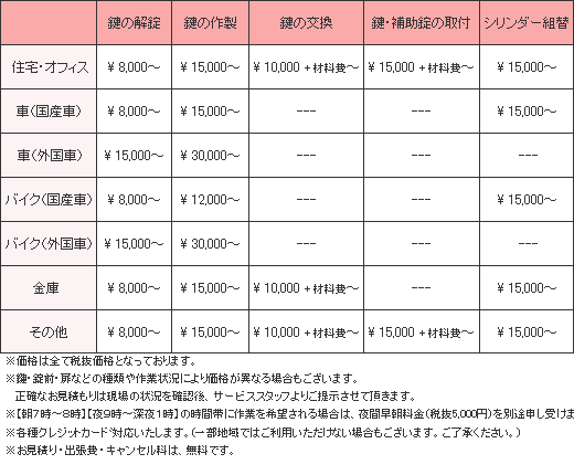 鍵に関する作業料金は明示されないことが多々あります。キーレスキューサービス大阪では、下記の料金一覧をもとに、実際に現場にて作業にとりかかかる前に明確な作業料金をお伝えいたします。お見積もりは完全無料となっておりますので、お気軽にお問合せください。